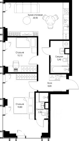 Продаётся 2-комнатная квартира общей площадью 66 м² с предчистовой отделкой в ЖК VEER на 57-м этаже 59 этажного дома.