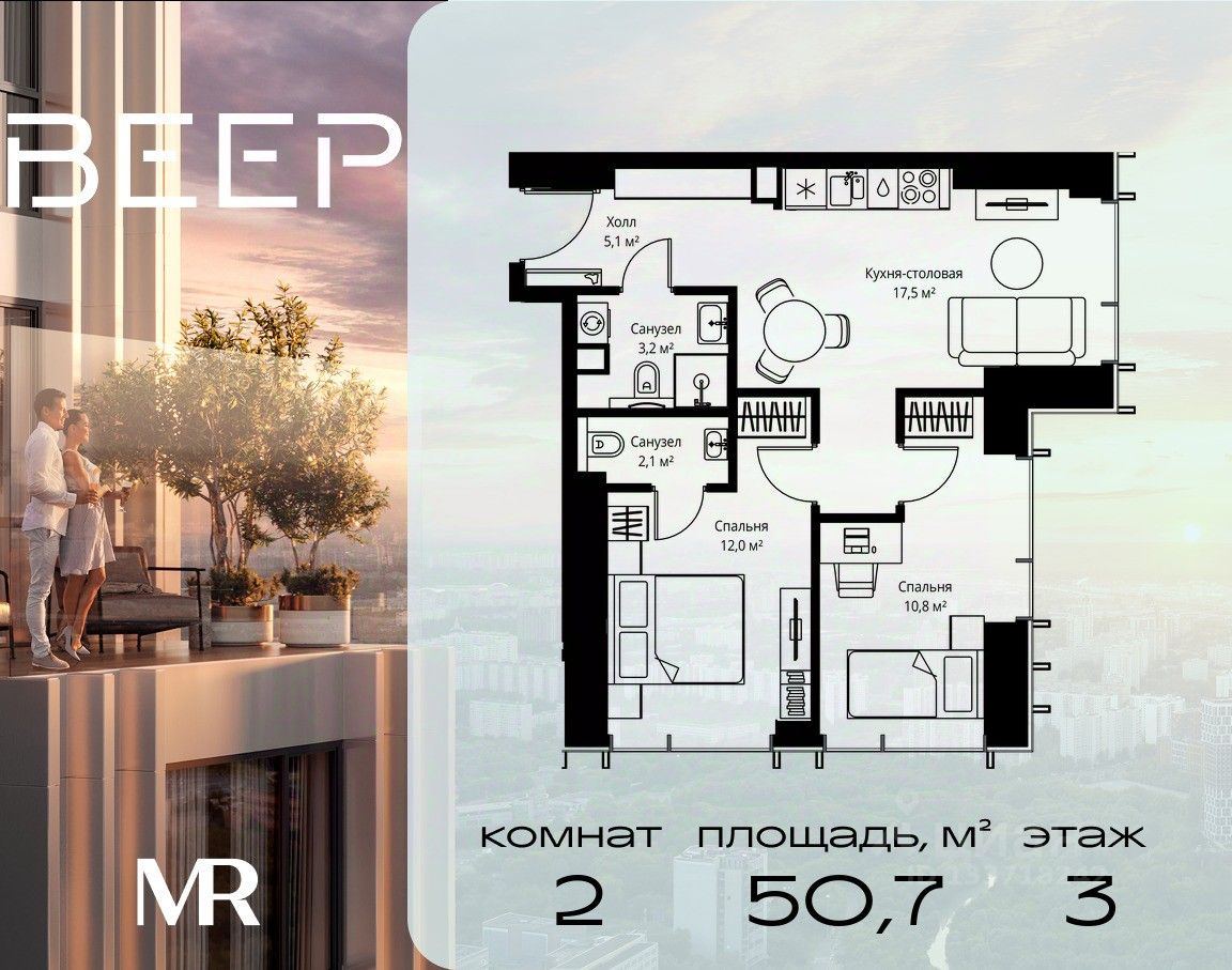 Продаётся 2-комнатная квартира общей площадью 50.70 м² без отделки в ЖК Веер на 3-м этаже 59 этажного дома.