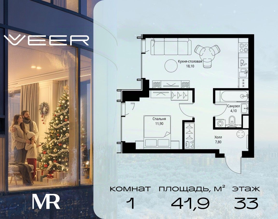 Продаётся 1-комнатная квартира общей площадью 41.90 м² с предчистовой отделкой в ЖК VEER на 33-м этаже 59 этажного дома.