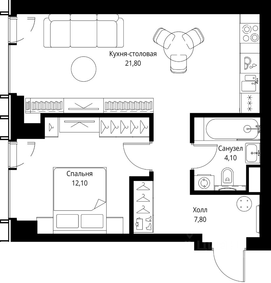 Продаётся 1-комнатная квартира общей площадью 45.80 м² с предчистовой отделкой в ЖК VEER на 15-м этаже 59 этажного дома.