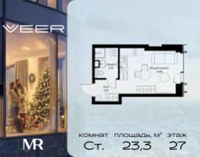 Продаётся студия общей площадью 23.30 м² с предчистовой отделкой в ЖК VEER на 27-м этаже 59 этажного дома.
