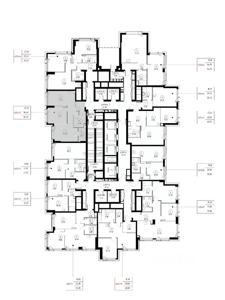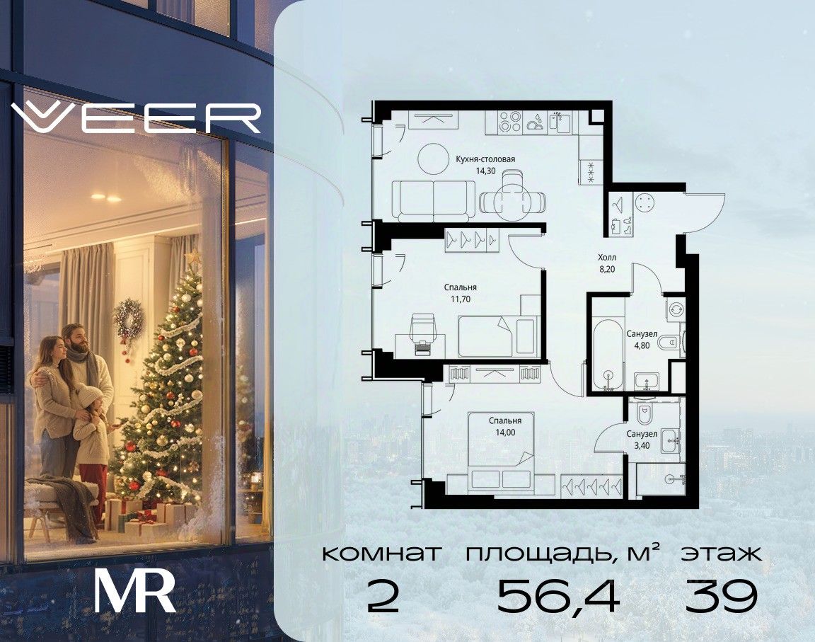 Продаётся 2-комнатная квартира общей площадью 56.40 м² с предчистовой отделкой в ЖК Веер на 39-м этаже 59 этажного дома.