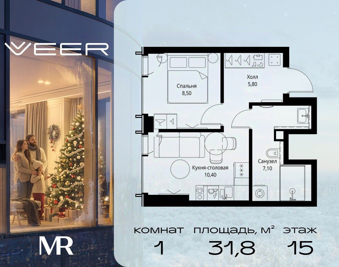 Продаётся 1-комнатная квартира общей площадью 31.80 м² с предчистовой отделкой в ЖК VEER на 15-м этаже 59 этажного дома.