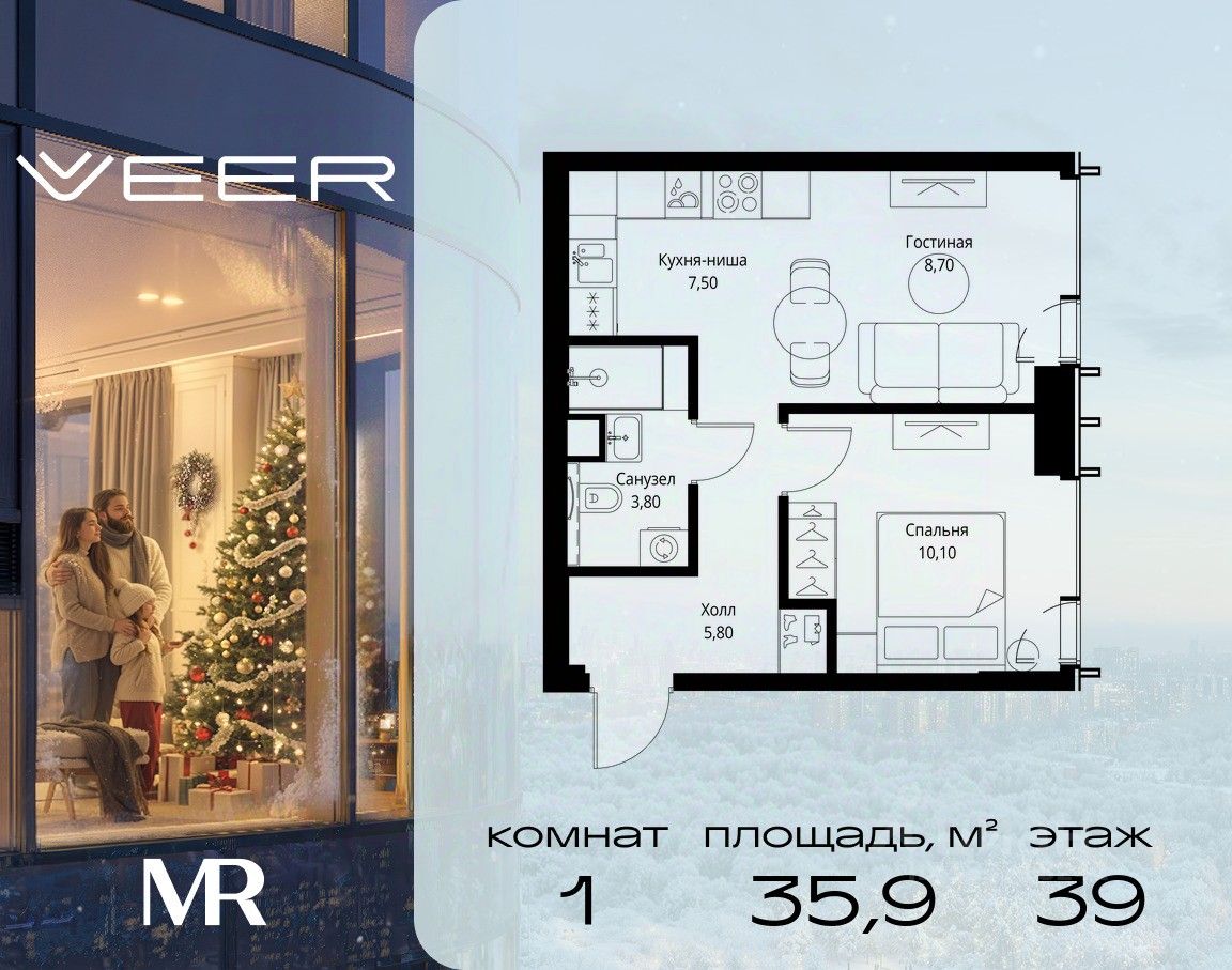 Продаётся 1-комнатная квартира общей площадью 35.90 м² с предчистовой отделкой в ЖК VEER на 39-м этаже 59 этажного дома.