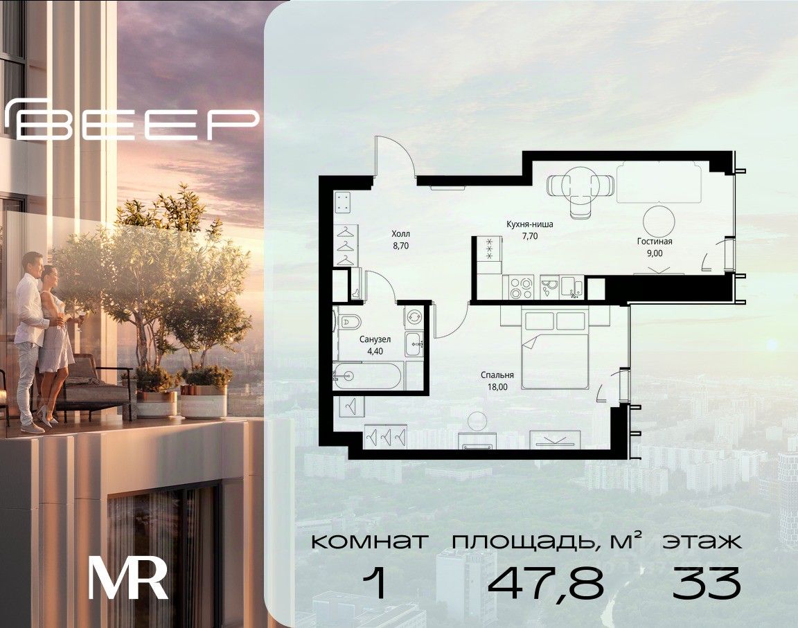 Продаётся 1-комнатная квартира общей площадью 47.80 м² с предчистовой отделкой в ЖК Веер на 33-м этаже 59 этажного дома.