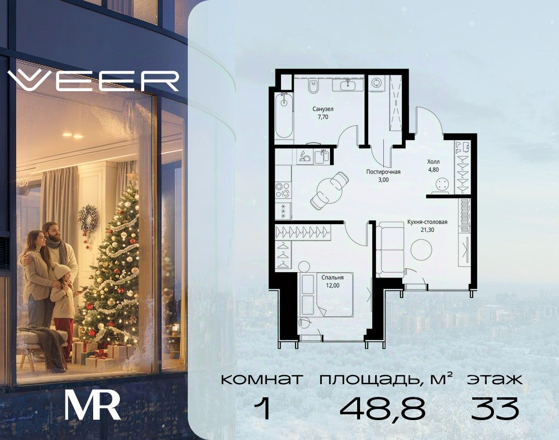 Продаётся 1-комнатная квартира общей площадью 48.80 м² с предчистовой отделкой в ЖК VEER на 33-м этаже 59 этажного дома.