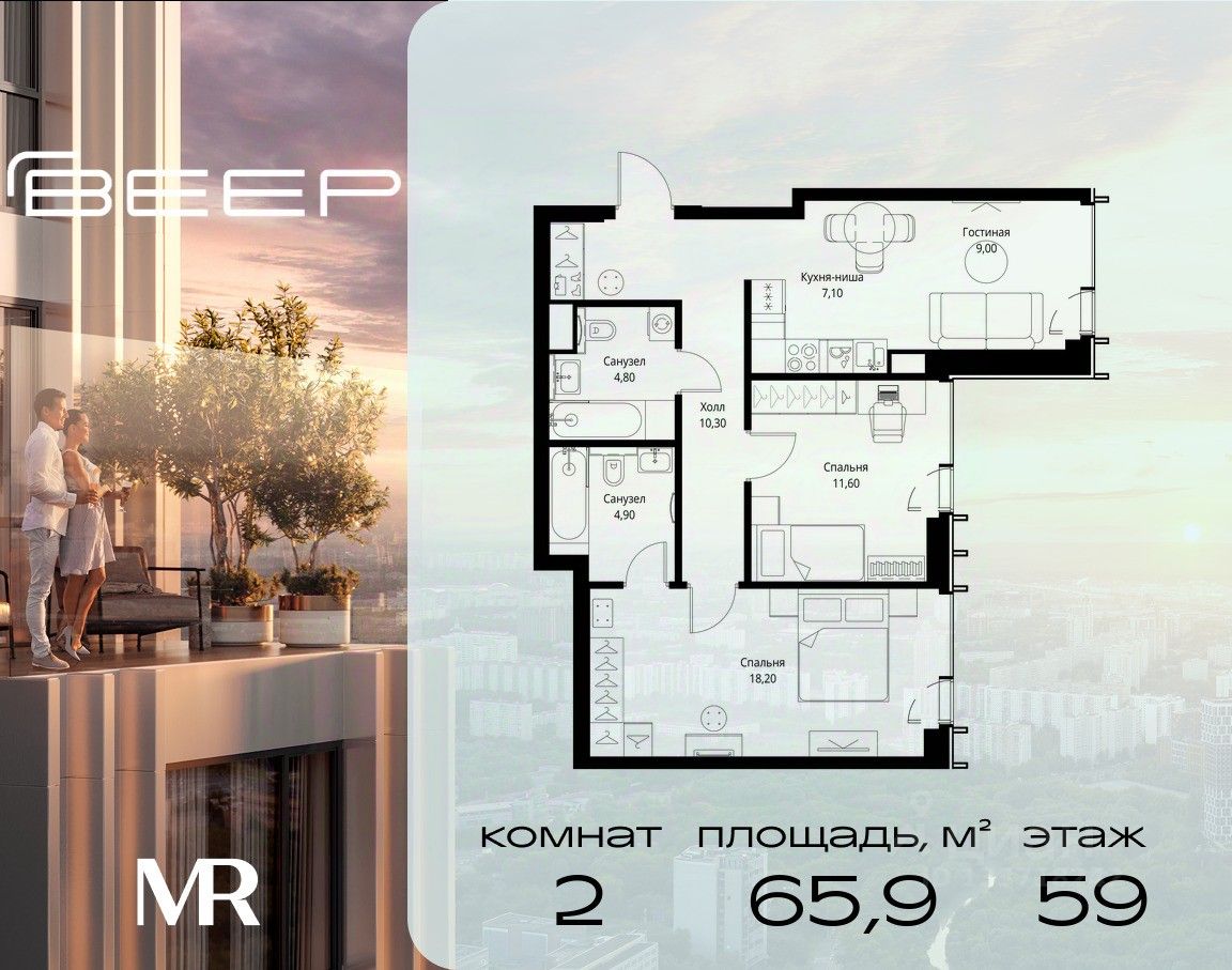 Продаётся 2-комнатная квартира общей площадью 65.90 м² с предчистовой отделкой в ЖК Веер на 59-м этаже 59 этажного дома.