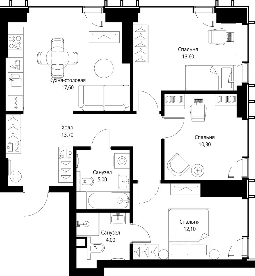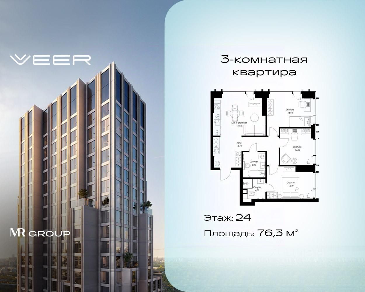 Продаётся 3-комнатная квартира общей площадью 76.30 м² с предчистовой отделкой в ЖК VEER на 24-м этаже 59 этажного дома.