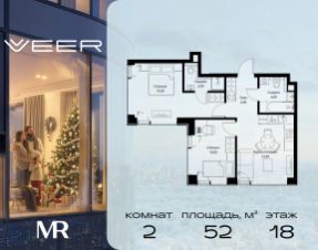 Продаётся 2-комнатная квартира общей площадью 52 м² с предчистовой отделкой в ЖК VEER на 18-м этаже 22 этажного дома.