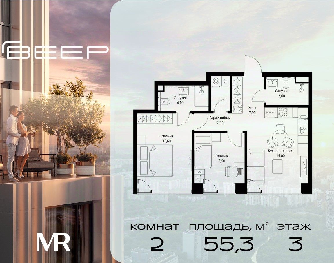 Продаётся 2-комнатная квартира общей площадью 55.30 м² с предчистовой отделкой в ЖК Веер на 3-м этаже 22 этажного дома.