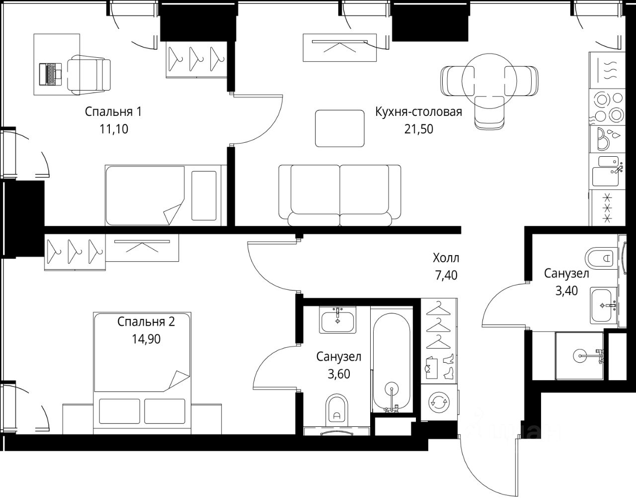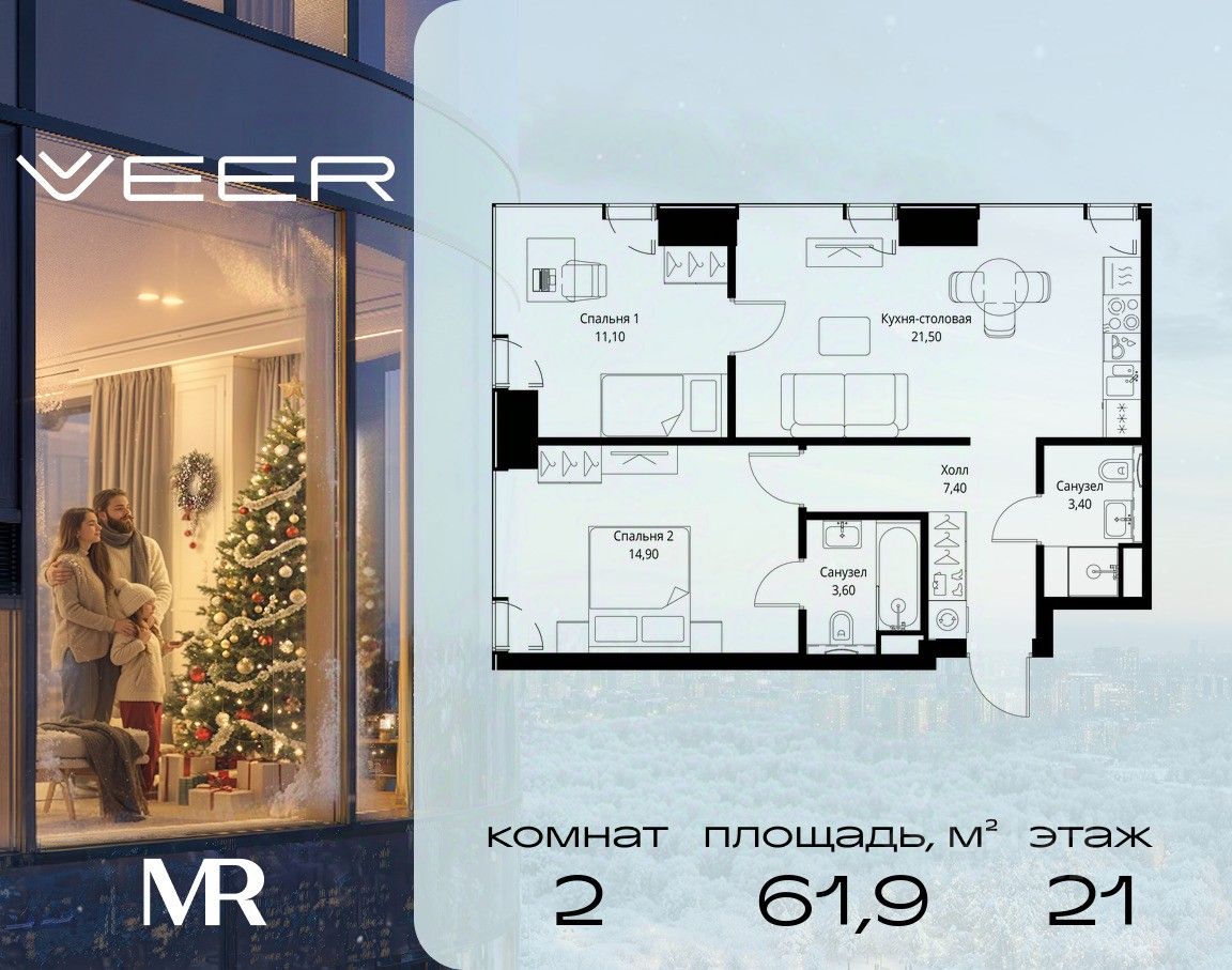 Продаётся 2-комнатная квартира общей площадью 61.90 м² с предчистовой отделкой в ЖК VEER на 21-м этаже 46 этажного дома.