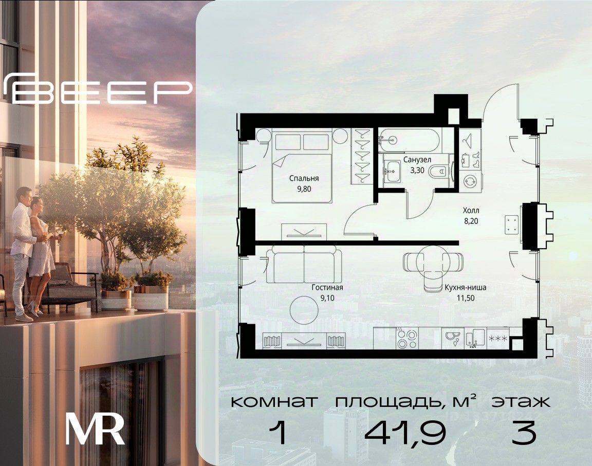 Продаётся 1-комнатная квартира общей площадью 41.90 м² с предчистовой отделкой в ЖК Веер на 3-м этаже 46 этажного дома.