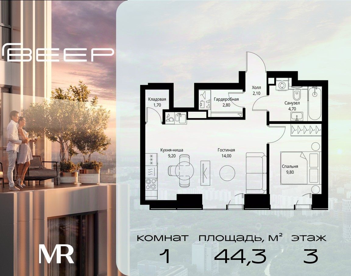 Продаётся 1-комнатная квартира общей площадью 44.30 м² с предчистовой отделкой в ЖК Веер на 3-м этаже 46 этажного дома.
