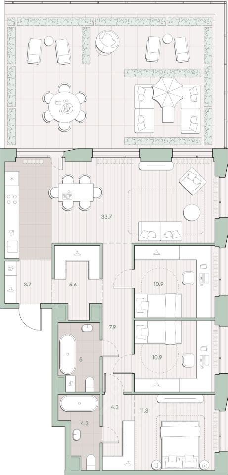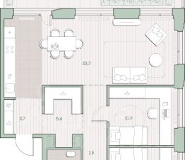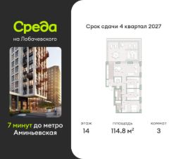 Продаётся 3-комнатная квартира общей площадью 114.8 кв.м. без отделки. Квартира расположена на 14 этаже корпуса 5.5 в жилом комплексе бизнес-класса "Среда на Лобачевского" в пешей доступности от метро "Аминьевская".
