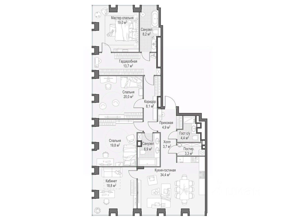 Просторная светлая квартира площадью 166,4 кв. м с окнами, выходящими в тихий приватный двор-парк с ландшафтным дизайном и на парк "Красногвардейские пруды". Панорамное остекление улучшает видовые характеристики квартиры. Продуманная планировка позволяет разместить кухню-гостиную и три спальни.