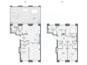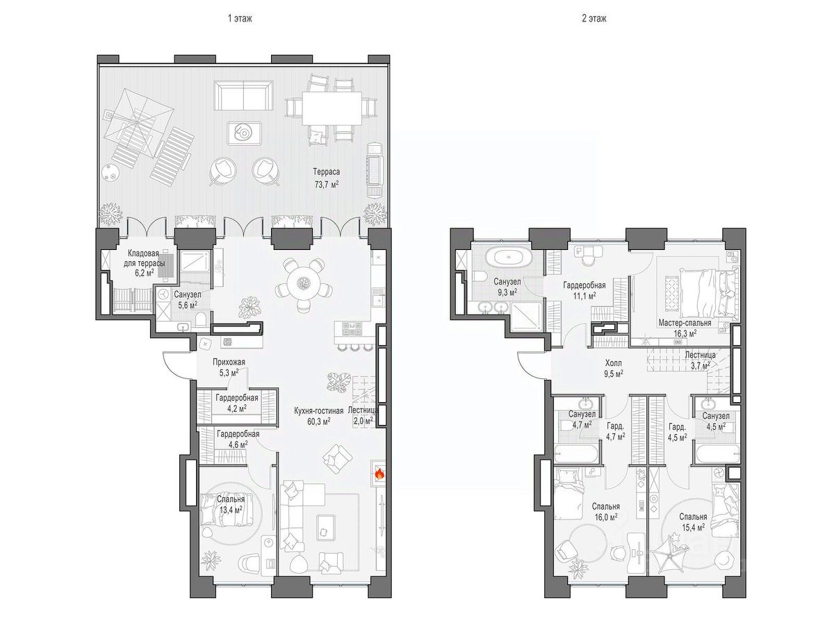 Просторный светлый пентхаус площадью 223,8 кв. м с террасой (73 кв. м). Кухня-гостиная обращена окнами в сторону парка "Красногвардейские пруды" и во внутренний двор-парк, а панорамные окна улучшают видовые характеристики пентхауса. В гостиной можно установить дровяной камин, создающий уютную атмосферу загородного пространства. Продуманная планировка позволяет разместить три приватные спальные комнаты с отдельными гардеробными и санузлами, в одном из которых предусмотрено окно.