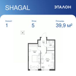 Общая площадь квартиры — 39.9 кв. м, этаж 5 из 14.