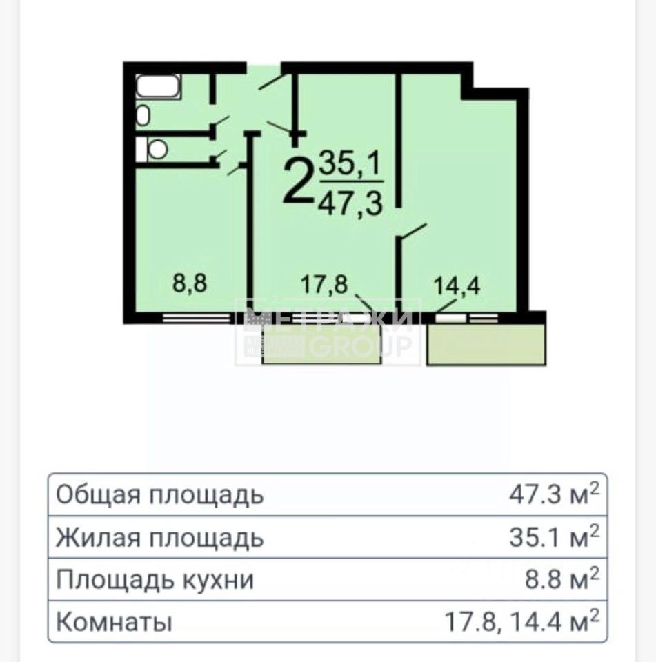 Общая жилая площадь составляет 32,2 квадратных метра, кухня — 8,8 квадратных метров. Особенностью квартиры является просторный балкон, выходящий на две комнаты, который может стать уютным местом для отдыха.