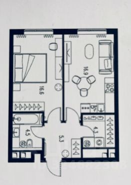 - комната 16,9 кв.м., кухня 16,9 кв.м., ванная комната 4,5 кв.м., гардеробная 4,3 кв.м., коридор 5,3 кв.м.