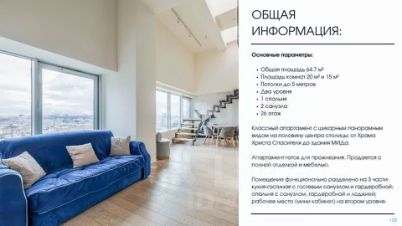Апартаменты отличаются продуманной планировкой с изолированной спальней и просторной кухней-гостиной. Ключевые преимущества — высокие потолки 4 метра и панорамные окна, наполняющие пространство светом и открывающие отличный вид на Арбат.
