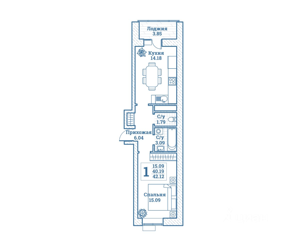 Общая площадь42,12 м²