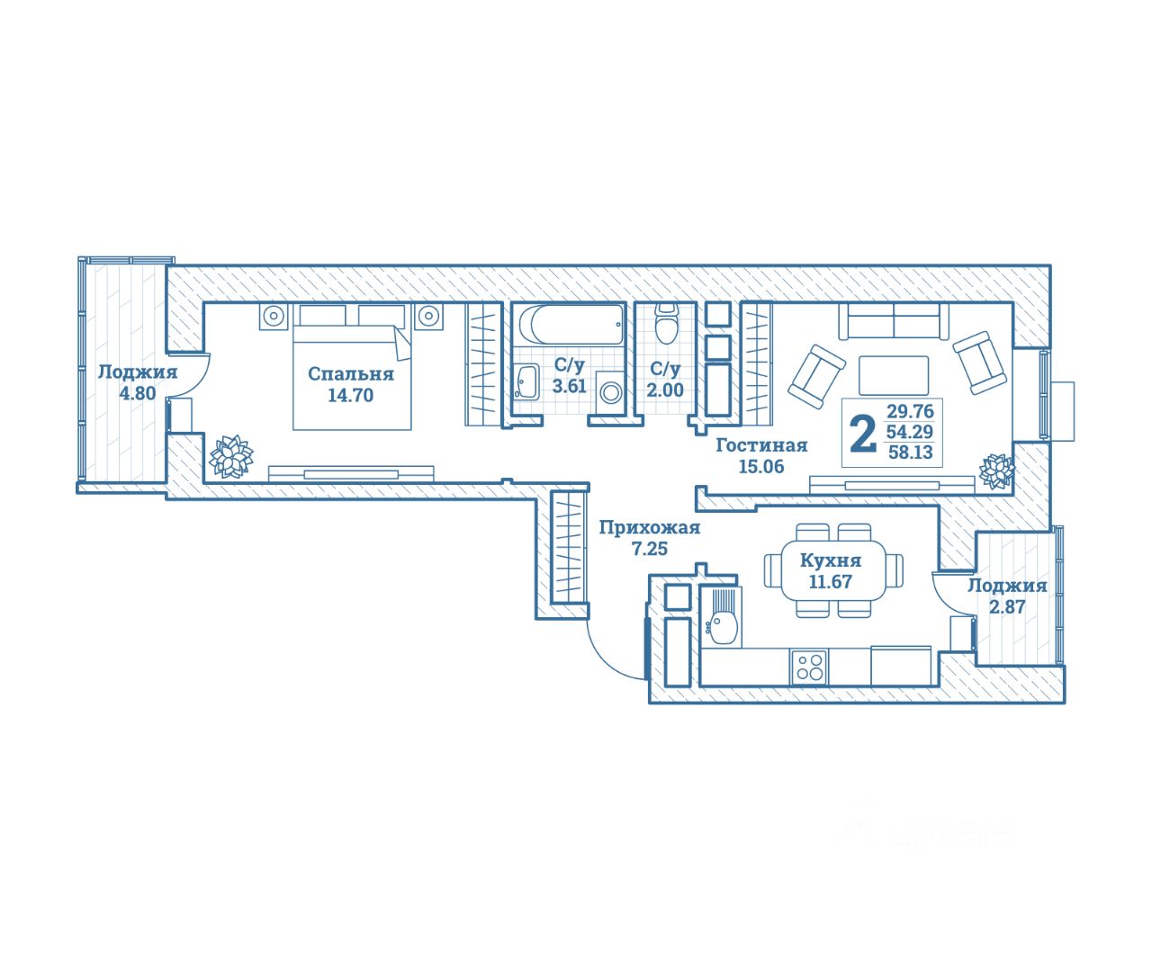 Общая площадь58,13 м²