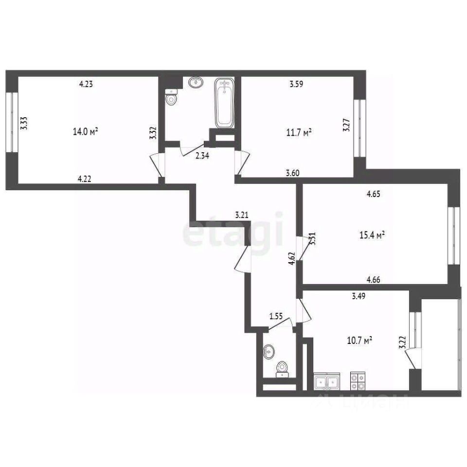 В планировке — три комнаты, один совмещённый и один отдельный санузел, балкон с панорамным видом.