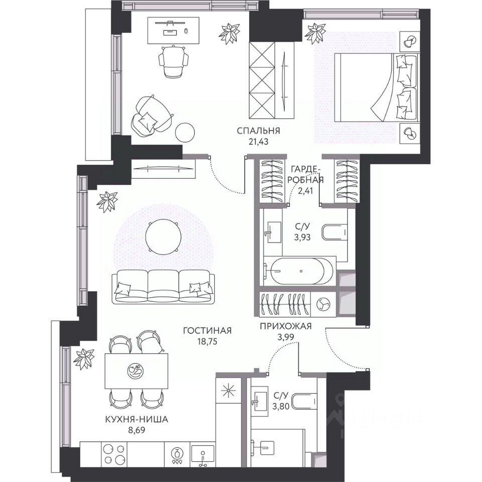 Предлагается готовая просторная 2-комнатная квартира 63,8 м² с отделкой white box на 27/None этаже в проекте hide жилом небоскребе премиум-класса от компании Dominanta и MR.