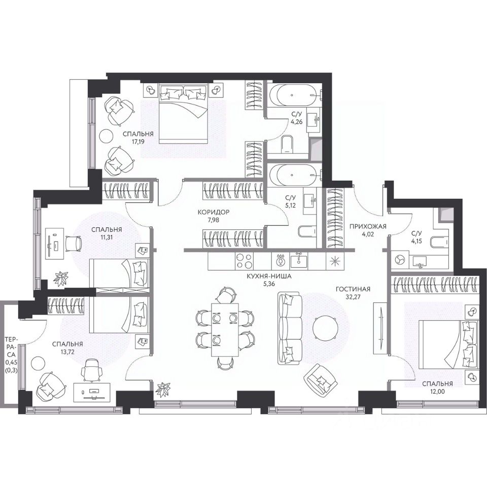 Предлагается готовая просторная 5-комнатная квартира 118,8 м² с отделкой white box на 38/None этаже в проекте hide жилом небоскребе премиум-класса от компании Dominanta и MR.
