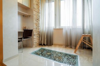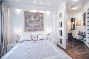 Открытая планировка включает в себя гостиную 18,6 кв.м. в теплых кремовых, переходящую в насыщенную солнцем кухню-столовую 15.5 кв.м., из которой есть выход на лоджию балкон с оборудованным рабочим местом, а также спальню 18 кв.м. с гардеробной комнатой и полноценной застекленной лоджией, из которой видны Олимпийские пруды, и детскую 12 кв.м.