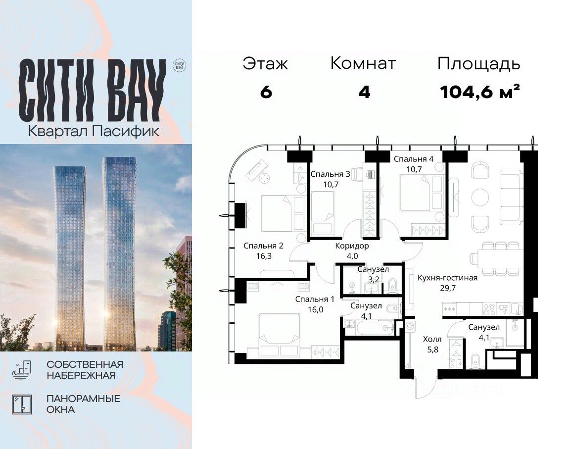 Продаётся 4-комнатная квартира общей площадью 104.60 м² без отделки в ЖК Сити Бэй, квартале Пасифик, на 6-м этаже 59 этажного дома.