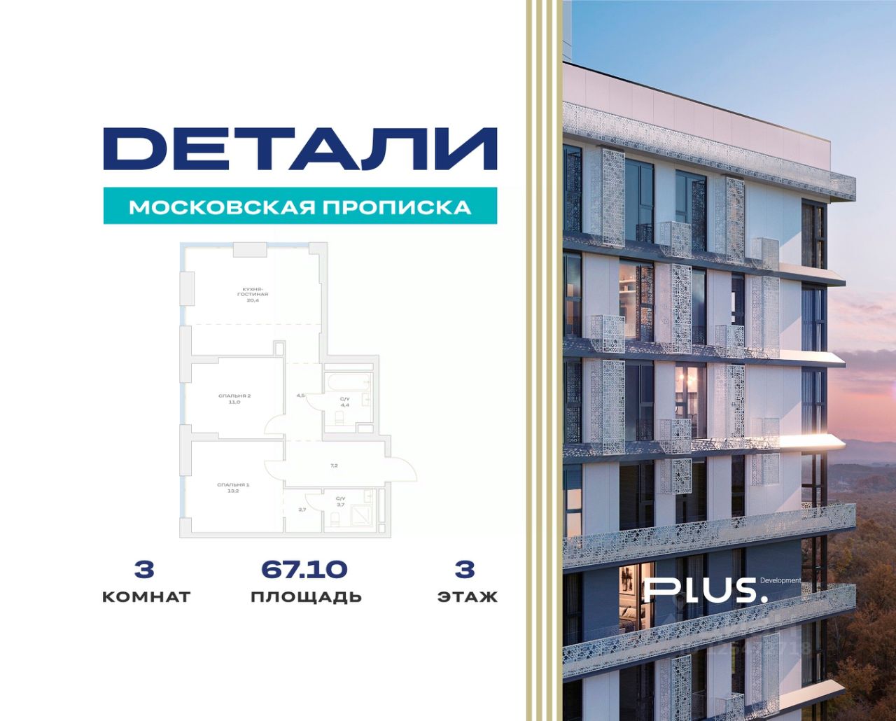 ЖК "Детали" | 3-комнатная квартира, 67.10 м², 3-й этаж.