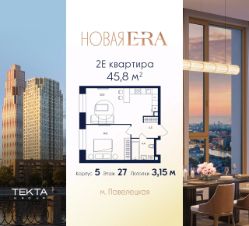 2-комн. квартира в ЖК "Era" на 27 этаже в 52 этажном здании Корпус 5. Общая площадь: 45.8 кв.м., жилая: 33.40 кв.м. Высота потолков 3.15 м.