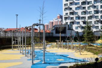 Уникальная фишка комплекса - SKY-парк на крыше - 1 га ландшафтного парка на высоте 12 метров с детскими и спортивными площадками, прокатом спортивного инвентаря, кафе, детскими развивающими и спортивными кружками.