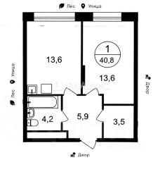 Общая площадь квартиры составляет 40,8 кв. м, из которых 17,5 кв. м — жилая площадь, а 13,6 кв. м — кухня. Высота потолков — 2,83 м, что создаёт ощущение простора и свободы. Квартира находится на 21 этаже, окна выходят на улицу.
