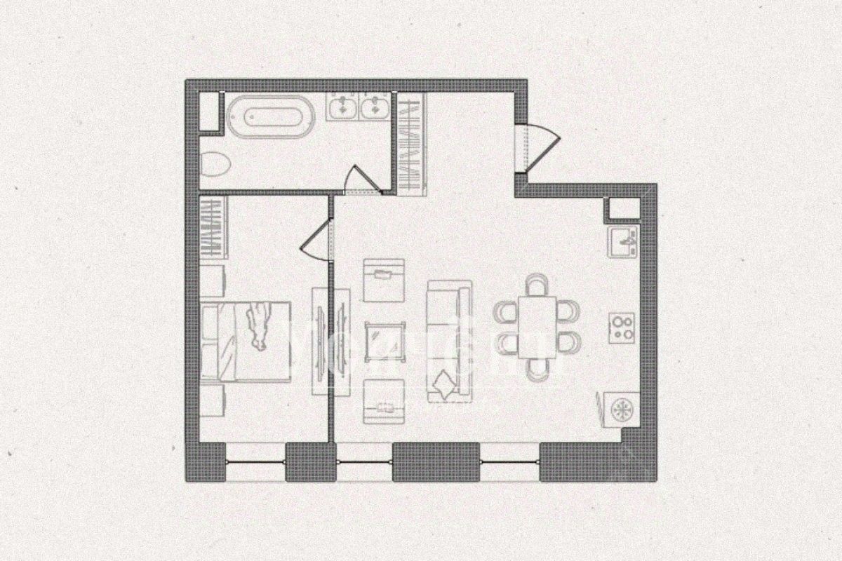 Текущее планировочное решение позволяет сформировать просторную кухню-гостиную, полноценную спальню и удобную ванную комнату. Формат свободной планировки без отделки даёт широкие возможности адаптировать пространство под индивидуальные задачи — увеличить зону гостиной, организовать кабинет, расширить систему хранения или создать более приватную спальню.