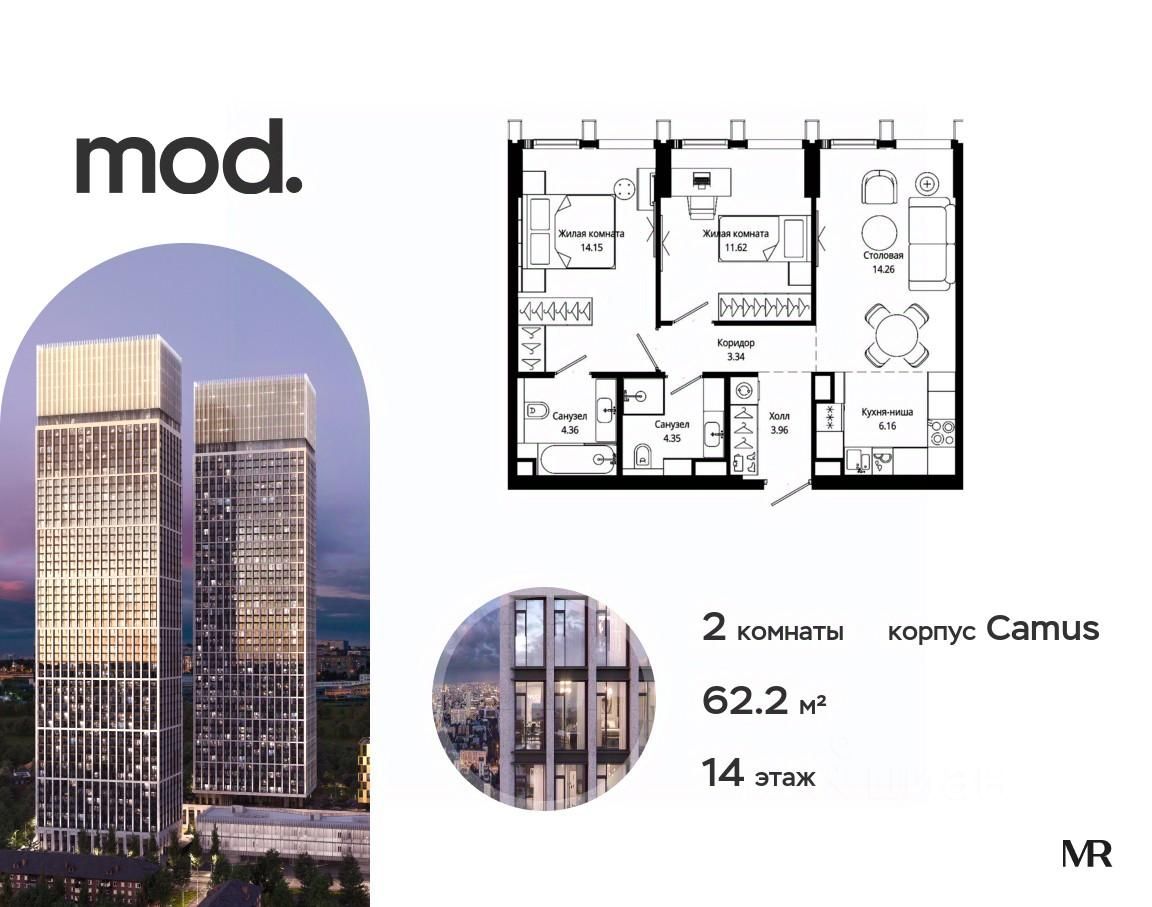 Продается 2-комнатная квартира общей площадью 62.20 м² с предчистовой отделкой в ЖК премиум-класса Mod на 14-м этаже 44 этажного дома.