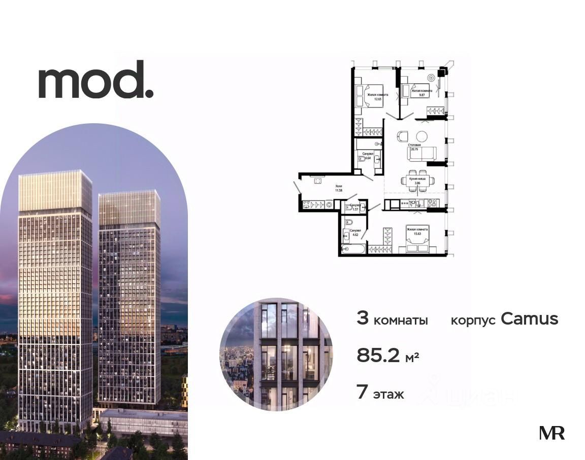 Продается 3-комнатная квартира общей площадью 85.21 м² с предчистовой отделкой в ЖК премиум-класса Mod на 7-м этаже 44 этажного дома.