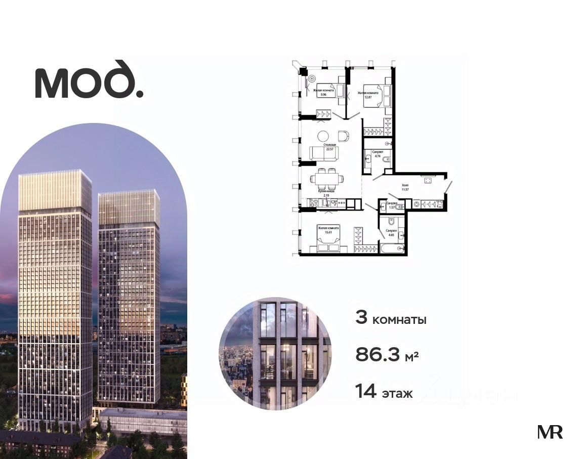Продается 3-комнатная квартира общей площадью 86.30 м² с предчистовой отделкой в ЖК премиум-класса Мод на 14-м этаже 44 этажного дома.