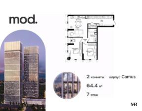 Продается 2-комнатная квартира общей площадью 64.49 м² с предчистовой отделкой в ЖК премиум-класса Mod на 7-м этаже 44 этажного дома.
