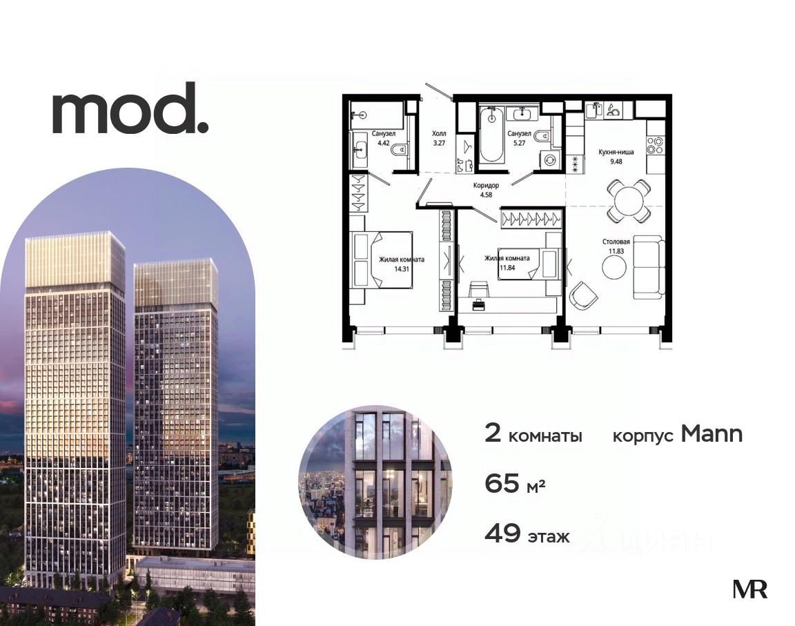 Продается 2-комнатная квартира общей площадью 65 м² с предчистовой отделкой в ЖК премиум-класса Mod на 49-м этаже 55 этажного дома.