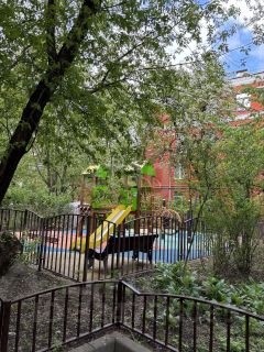 Большой внутренний двор утопает в зелени. Детская площадка. Много парковочных мест вокруг дома.