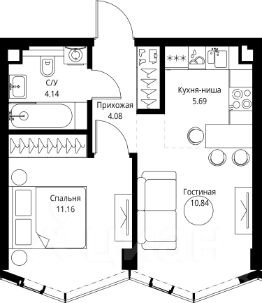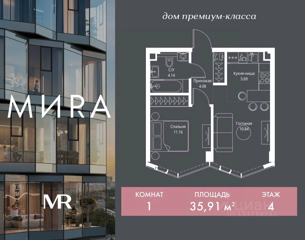 Продаётся 1-комнатная квартира общей площадью 35.91 м² без отделки в доме премиум-класса МИRА на 4-м этаже 24 этажного дома. Квартира расположена в корпусе 3.