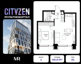 Продается 1-комнатная квартира от застройщика в жилом мультиквартале CITYZEN на 31-м этаже в корпусе #2 урбан-блока PARUS. Общая площадь лота составляет 39.60 м²