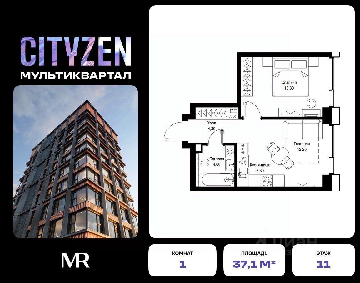 Продается 1-комнатная квартира от застройщика в жилом мультиквартале CITYZEN на 11-м этаже в корпусе #3 урбан-блока PARUS. Общая площадь лота составляет 37.10 м²