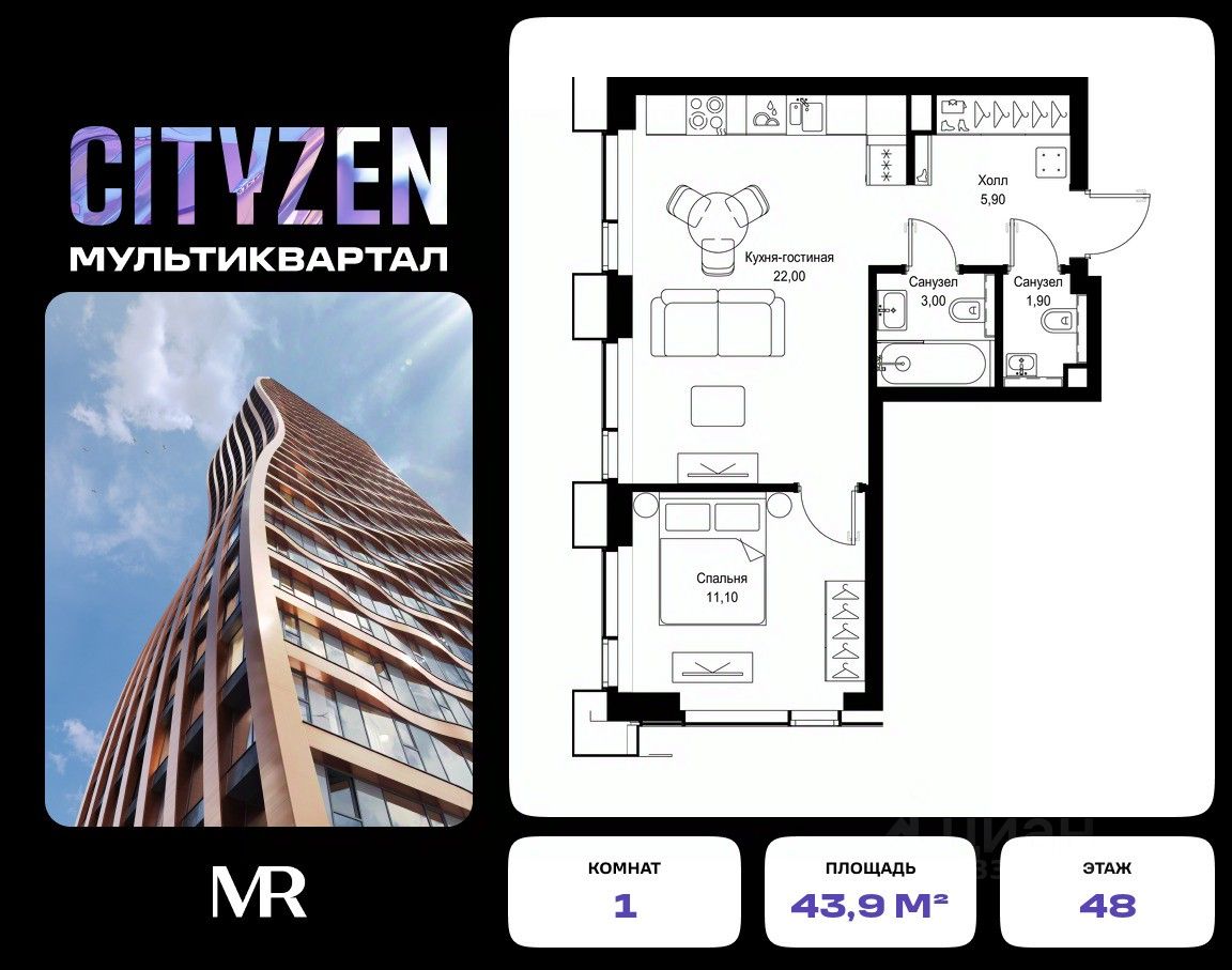 Продается 1-комнатная квартира от застройщика в жилом мультиквартале CITYZEN на 48-м этаже в корпусе #6 урбан-блока VOLNA. Общая площадь лота составляет 43.90 м²