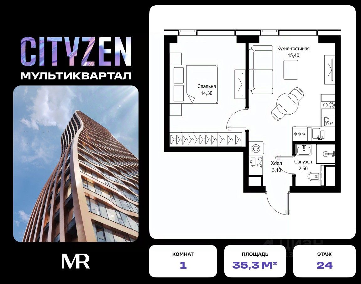 Продается 1-комнатная квартира от застройщика в жилом мультиквартале CITYZEN на 24-м этаже в корпусе #6 урбан-блока VOLNA. Общая площадь лота составляет 35.30 м²