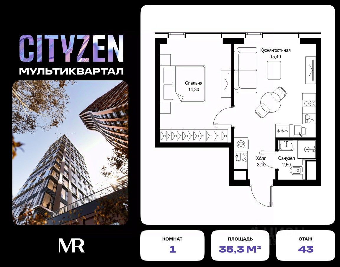 Продается 1-комнатная квартира от застройщика в жилом мультиквартале CITYZEN на 43-м этаже в корпусе #6 урбан-блока VOLNA. Общая площадь лота составляет 35.30 м²