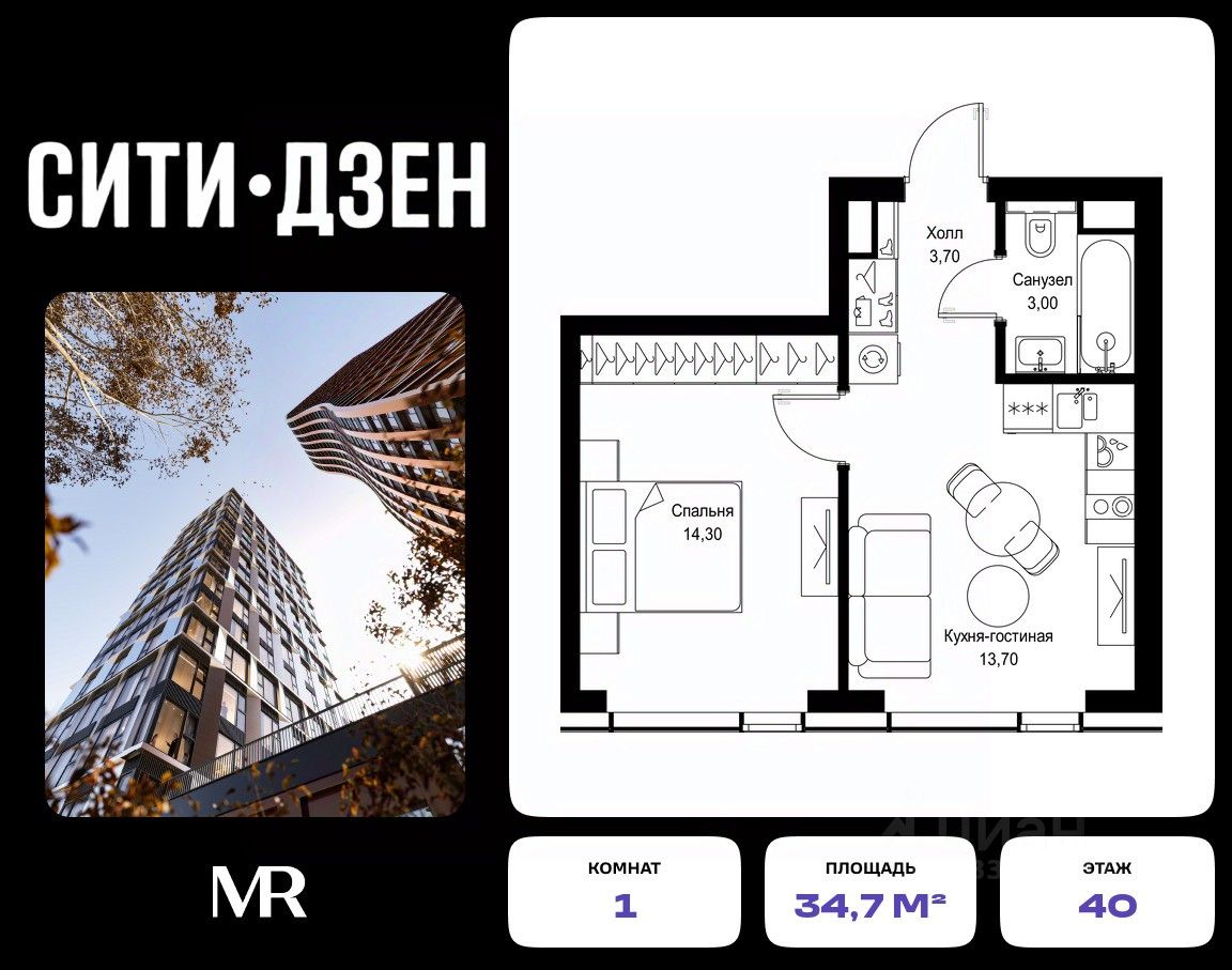 Продается 1-комнатная квартира от застройщика в жилом мультиквартале СИТИДЗЕН на 40-м этаже в корпусе #6. Общая площадь лота составляет 34.70 м²