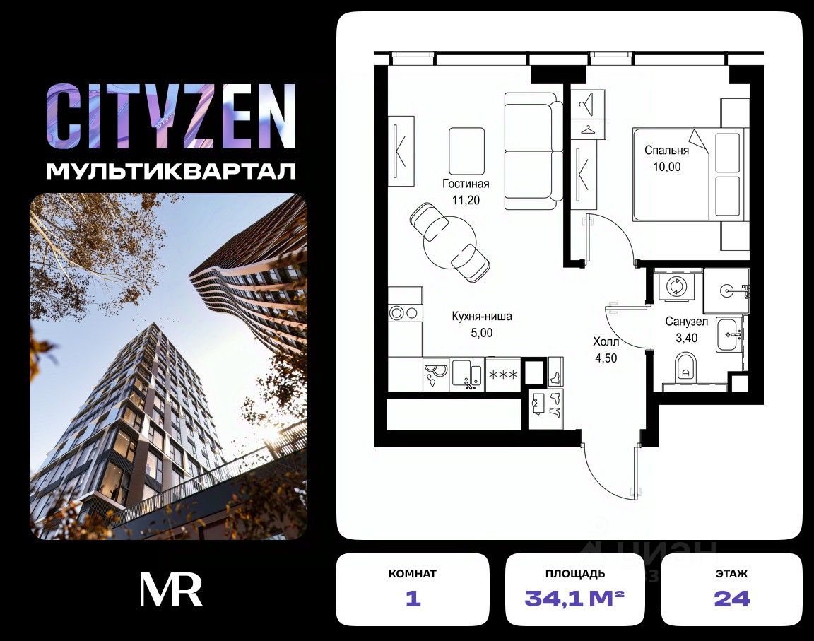Продается 1-комнатная квартира от застройщика в жилом мультиквартале CITYZEN на 24-м этаже в корпусе #6 урбан-блока VOLNA. Общая площадь лота составляет 34.10 м²